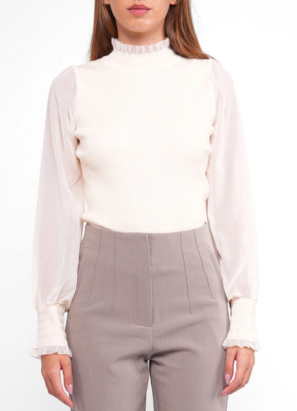 Long Sleeve High Neck Blouse with buttons on the back and elastic cuffs and chiffon sleeves