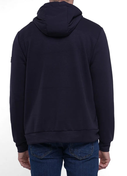 Sweatshirt Cardigan.Full zip sweatshirt with quilted nylon chest pockets and hood.53% Polyester,42% Rayon, 5% Spandex.