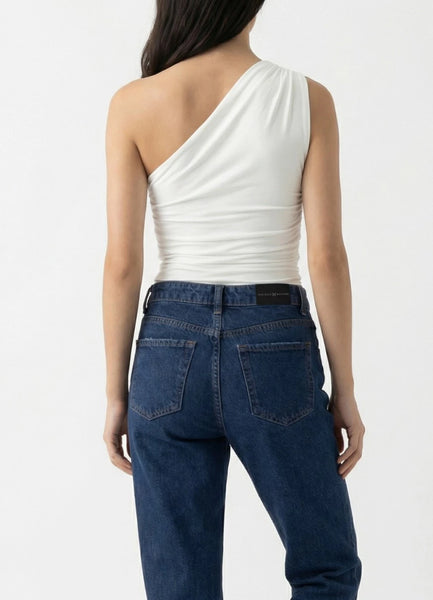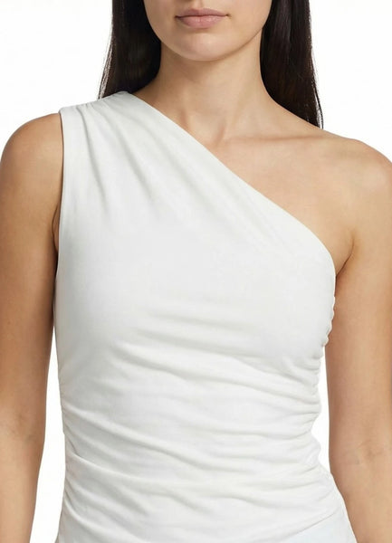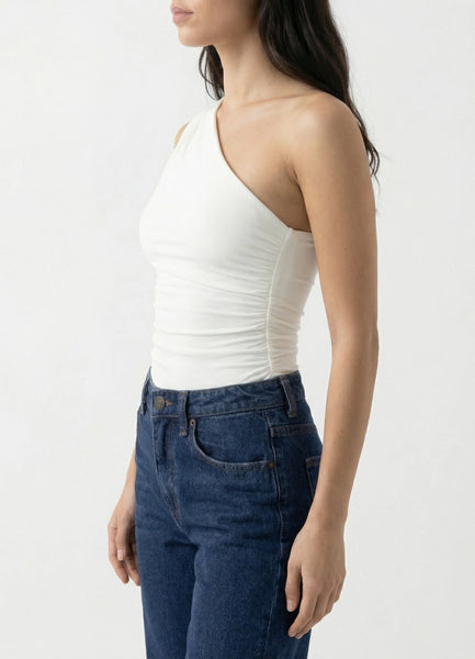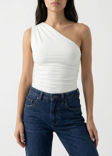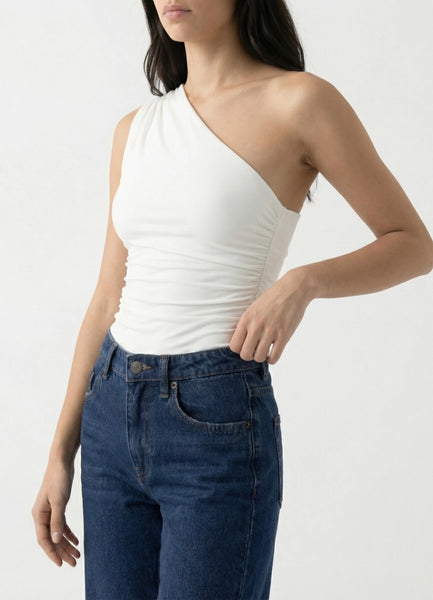 Bodysuit\nThis sleek sleeveless bodysuit features an asymmetric neckline and a draped, gathered side detail, creating a flattering silhouette perfect for any occasion.\n85% Nylon, 15% Spandex.