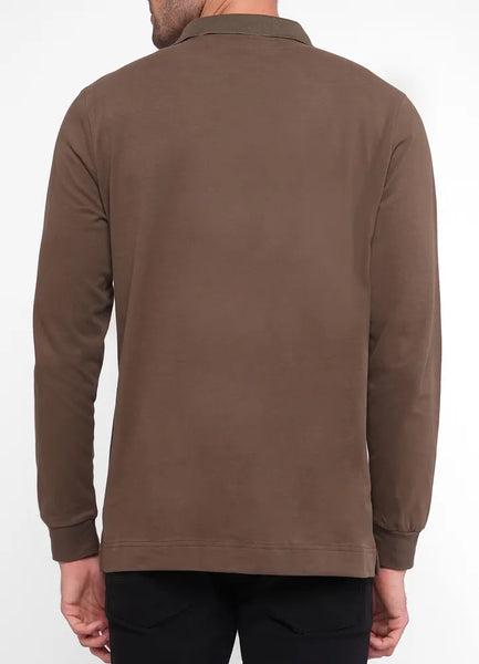 Plain basic jersey long sleeve poloshirt with Maison Brown metal branding on bottom.