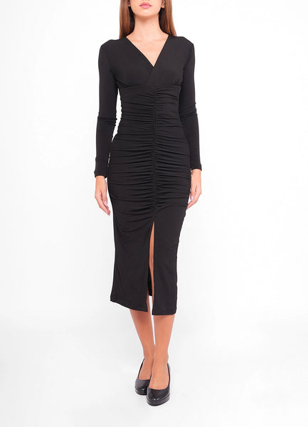 Dress. V Neck Midi long sleeve dress with a side slit. 82% Polyester 18% Spandex