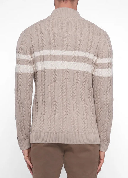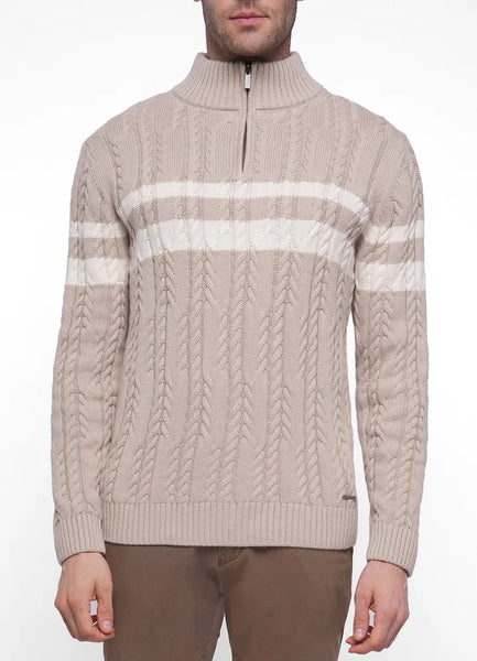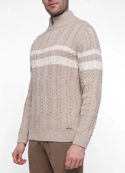 Knitwear.Lev half zip cable knit sweater with front stripes.100% Cotton.