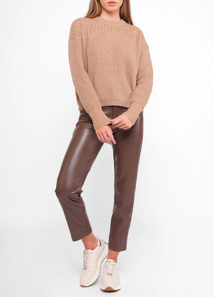 Knitwear.Round neck sweater with perforated shoulders and silver detailing .53% acrylic, 36% nylon,8% wool, 3% metalic