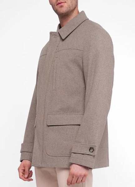 Lio outdoor wool coat with two patch pockets and zipped pocket on chest and collar.