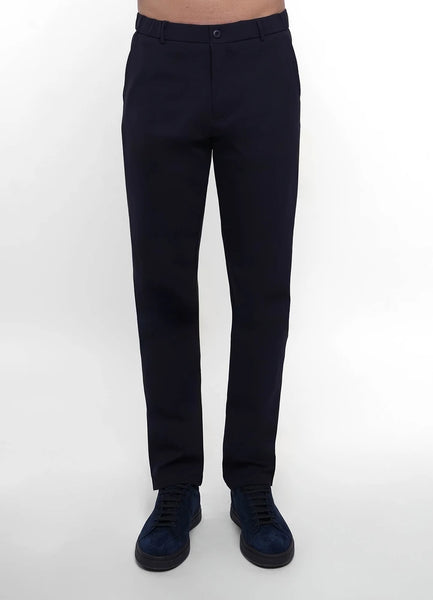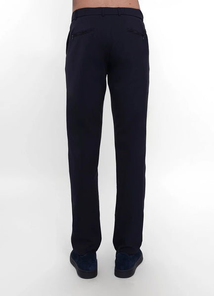 Drawstring fancy flex flat front pants with zipped pockets on back.